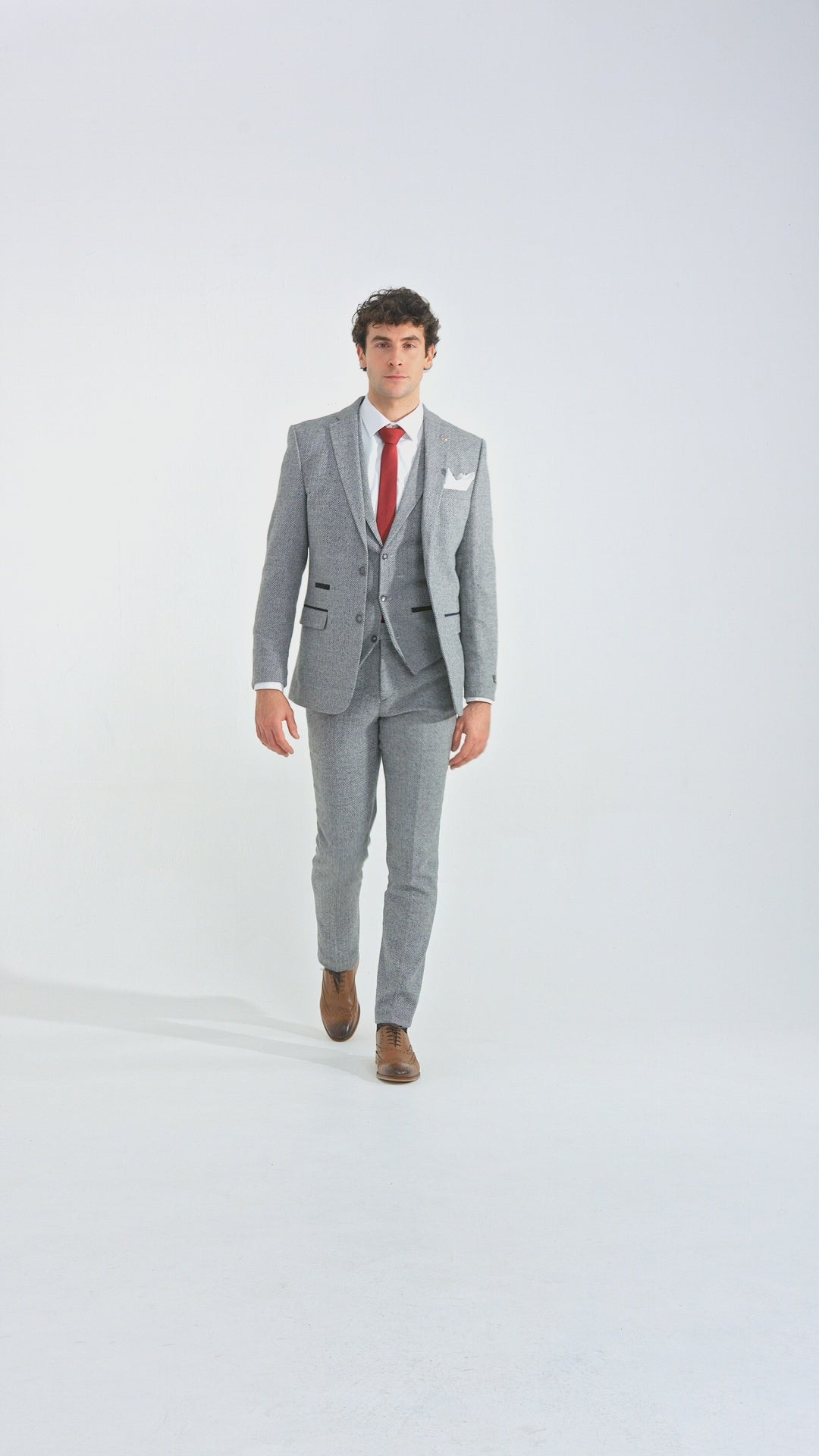 Jasnoszary męski garnitur tweedowy w jodełkę, 3-częściowy - STZ11
