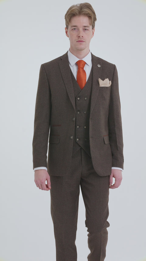 Męski brązowy garnitur 3-częściowy z dwurzędową kamizelką