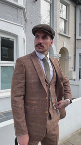 Męski garnitur 3-częściowy z wełny tweedowej w jodełkę, brązowy, w niebieską kratkę, lata 20. XX wieku, Gatsby