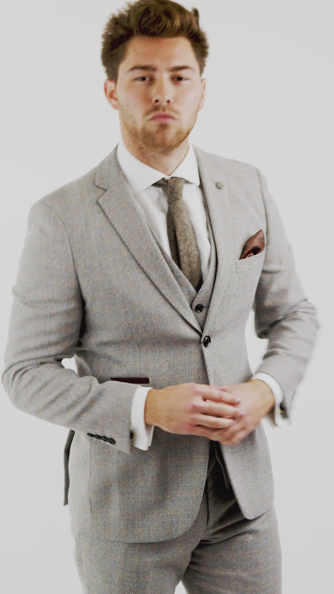 Trzyczęściowy męski garnitur tweedowy w kratkę – kremowy